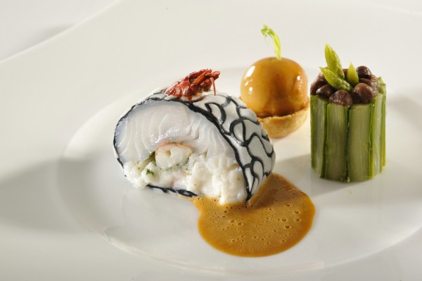 Flétan retour de nasse, coque Nantua, chartreuse d’asperges vertes aux mousserons des prés