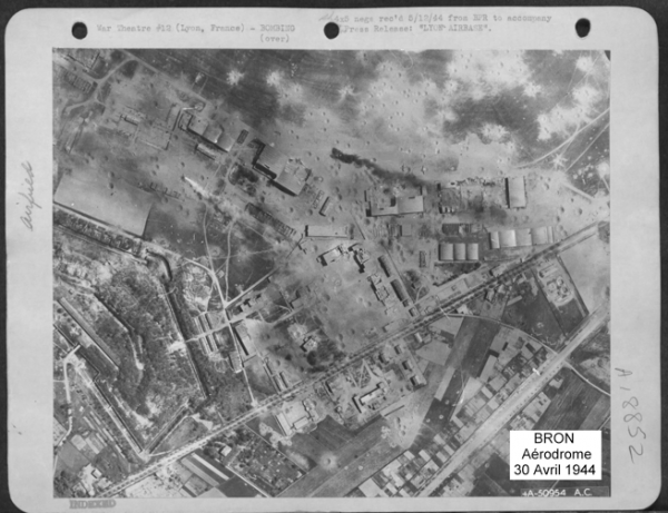 Entre 11h 43 et 11h 51, 108 B 17 du 14th Bomber Wing (44 et 392 squadrons) et du 95th Bomber Wing (489 et 191 squadrons) de la 8th Air Force, larguent 1813 bombes de 100 lb, 494 bombes de 500 lb et 1142 bombes de 100 lb. incendiaires sur le terrain d’aviation de Lyon-Bron.