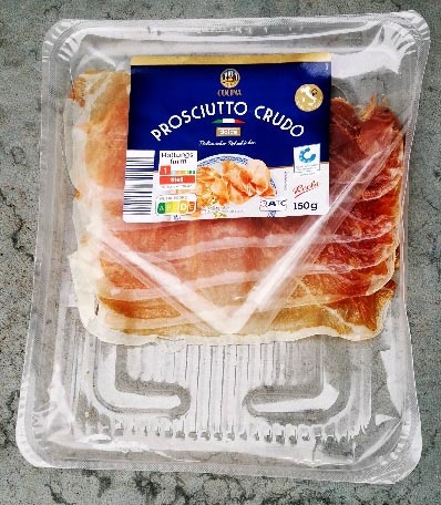 En Français: Ce «jambon sec cru», est vendu en barquette filmée, finement tranché à la machine.