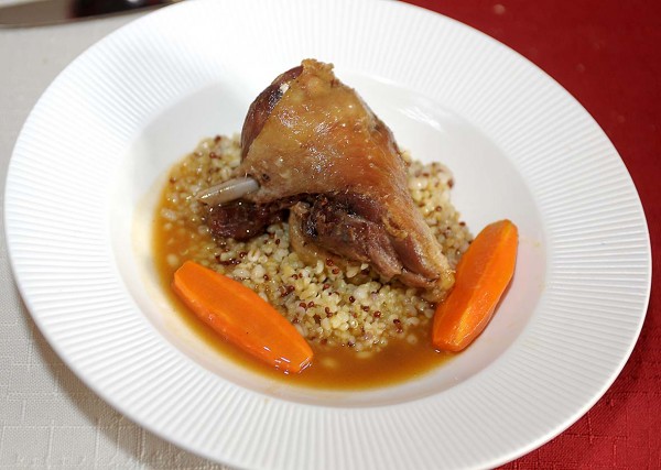 La tajine de canard confit avec son couscous de graines oubliées (Quinoa, boulgour et orge pelé) est tout aussi classique avec une pointe orientaliste en plus cependant. Les goûts sont toujours présents et bien marqués, le canard d’une tendreté exceptionnelle et son couscous original. Au dépaysement près, on se croirait dans un bouchon. Pourquoi pas à Marrakech !