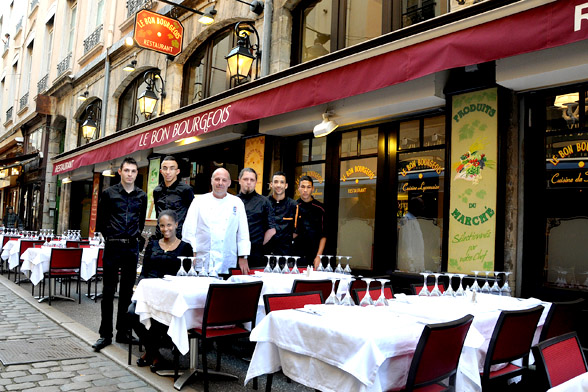 Lyon Mai 2012 – A l’instar de la rue Mercière, la très authentique rue des Marronniers fait la part belle aux restaurants, plutôt typés lyonnais, tant il est vrai qu’ils représentent plus de 90 % des commerces de cette petite rue piétonne située à quelques mètres de la Place Bellecour. Parmi ces restaurants, Franck Baldassini et son Bon Bourgeois s’y sont fait une place de choix depuis 2006 .