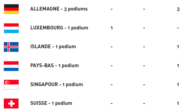 La Suède compte maintenant 4 podiums: 1 en Or, 4 en Argent et 0 en Bronze.