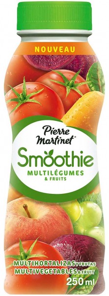 Appelée à se développer très rapidement (les recherches sont en cours) la gamme de smoothies de légumes Pierre Martinet comporte cinq références : tomate-orange-framboise, betterave-raisin blanc, concombre-menthe-citron, carotte-pomme-thé vert et multi-légumes et fruits.