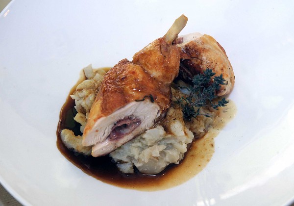 Ce plat est d’une facture que l’on pourrait qualifier de généreuse-rustique. Itoo pour le suprême de volaille fermière servi avec son écrasée de topinambour au jus gras à la sauge. Petite cerise sur le gâteau de cette viande bien cuite, mais très mœlleuse, une mini farce à la scarmoza blanche et au speck.