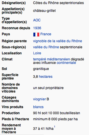 Enclavé au sein de l’appellation Condrieu, ce vignoble-pépite est constitué d’un ensemble de petites terrasses formant un cirque, parfaitement exposées au Sud. Implanté sur un sol granitique, il est exclusivement constitué du cépage blanc viognier, et pourtant le vin dont il est issu se distingue de ceux de Condrieu. Ce nectar affiche une robe dorée développant une vaste palette d’arômes de fleurs, de fruits frais et secs avec une pointe de minéralité. Il s’agit d’un vin concentré, souvent austère dans sa jeunesse, nécessitant un vieillissement plus long que ses voisins de Condrieu pour qu’il puisse s’exprimer pleinement.