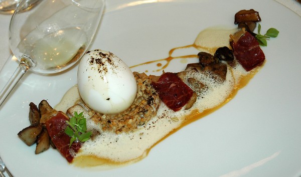 Œuf mollet, champignons et jambon iberico avec un champagne Lettre à Terre (Extra brut) de Christian Bourmault.