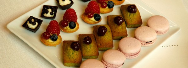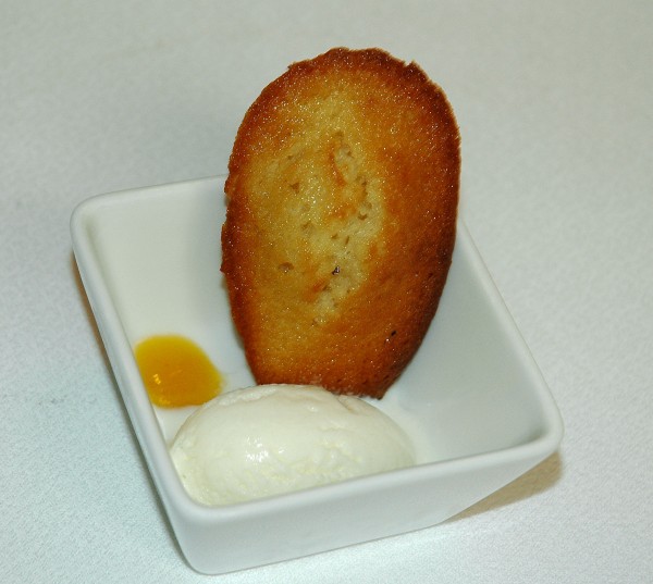Madeleine tiède au miel et tartelette à la rhubarbe, feuillantine de fruits rouges et milk shake aux fraises, servis avec un Brut rosé de chez RH Coutier.
