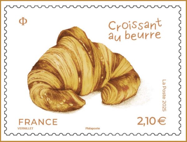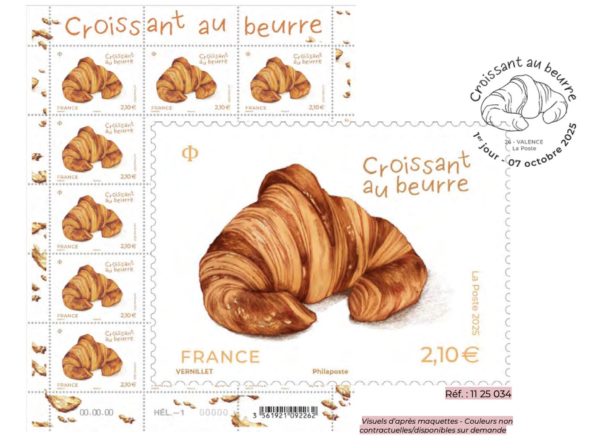 Le 8 octobre 2025, La Poste va émettre un timbre à 2,10€, ainsi qu’un un souvenir philatélique odorants, illustrés par un délicieux croissant au beurre, un classique de la boulangerie française.