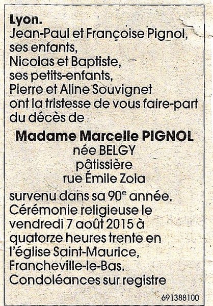 Nous apprenons ce jour avec beaucoup de tristesse le décès de Marcelle Pignol (née Belgy), la maman du célèbre pâtissier traiteur lyonnais, Jean-Paul Pignol (MOF).
