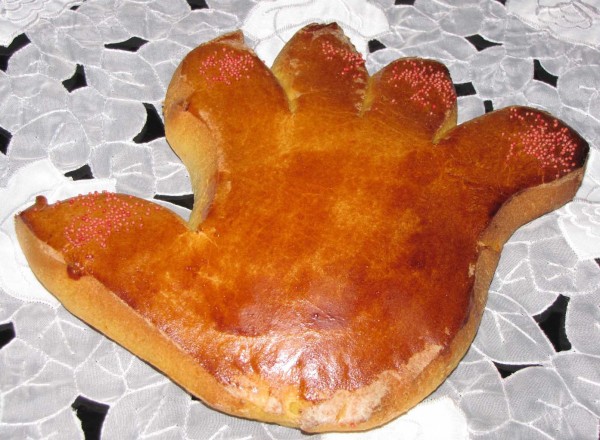Aujourd’hui, ce dessert est une sorte de brioche au safran en forme de main.