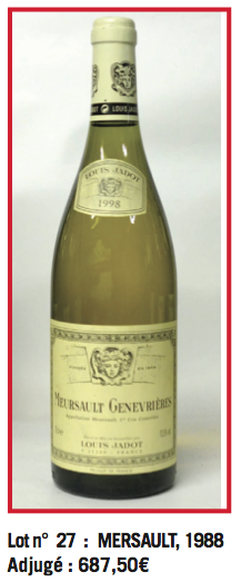 1 bouteille de Meursault, 1er Cru « Genevrières », L. Jadot, 1988, adjugée 687,50 € frais compris. (Lot n° 27)