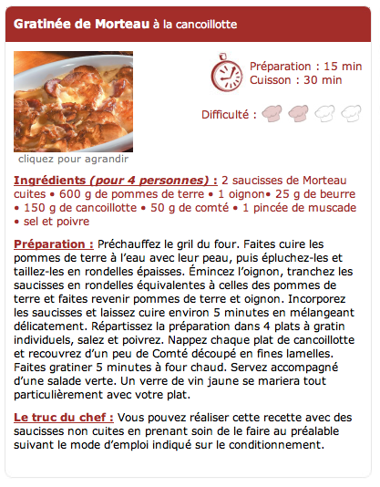 Lyon Saveurs a le plaisir de vous offrir cette recette gourmande de gratinée de Morteau à la cancoillotte grâce à L’Association de Défense et Promotion des Charcuteries et Salaisons IGP de Franche-Comté. Cette association qui a vu le jour le 10 mai 2004 réunit l’ensemble des acteurs de la filière « salaisons comtoises » (fabricants d’aliments du bétail,éleveurs,abatteurs-découpeurs,fabricants industriels et artisanaux,organismes associés et partenaires), elle a pour but de défendre ce patrimoine culinaire unique.