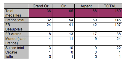 Les vins français, quant à eux, à travers les cuvées des producteurs des régions du Beaujolais, du Val de Loire, de la Vallée du Rhône ou encore du Sud Ouest se sont vu attribuer 145 médailles parmi lesquelles 32 Grand Or, 54 Or et 59 Argent.