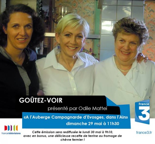 Odile Mattei a posé ses caméras à l’Auberge Campagnarde d’ Evosges dans l’Ain. La diffusion de cette prochaine émission Goûtez-Voir est programmée pour le dimanche 29 mai à 11h30 sur France 3 Rhône-Alpes Auvergne.