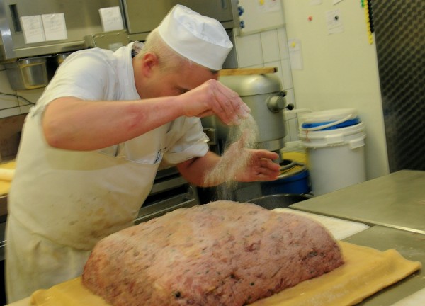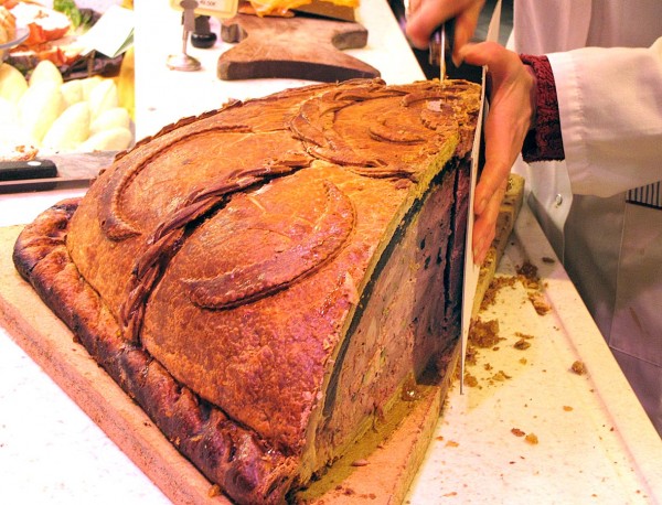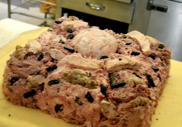 Caille, pigeon, palombe, perdreau, grouse, volaille de Bresse AOC, canard mulard, faisan, colvert, lièvre, lapin de garenne, chevreuil, biche, marcassin, foie gras, ris de veau, truffes du Tricastin, ainsi que des farces diverses…) Inutile de vous dire que modeler la farce de ce pâté selon un plan de montage aussi précis que rigoureux n’est pas une mince affaire.