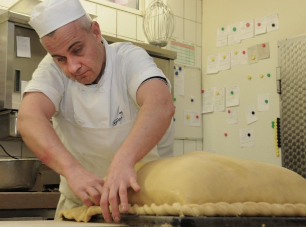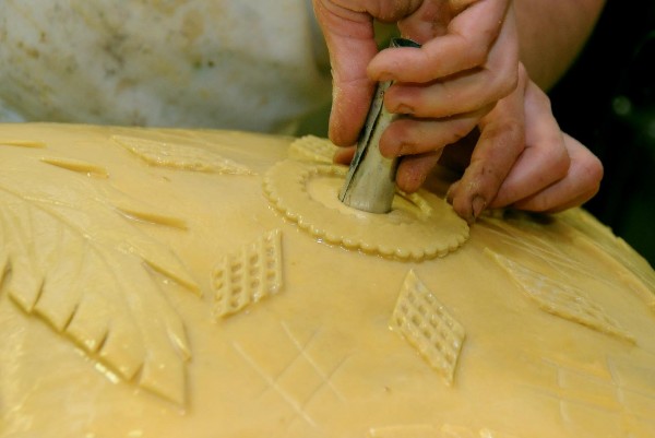 Une fois le modelage réalisé à la main sur une abaisse de pâte brisée ( la seule qui supporte l’opération), une seconde abaisse est déposée dessus telle un couvercle, puis affinée sur les côtés pour égaliser le tout avec élégance et procurer une « étanchéité » quasi parfaite.