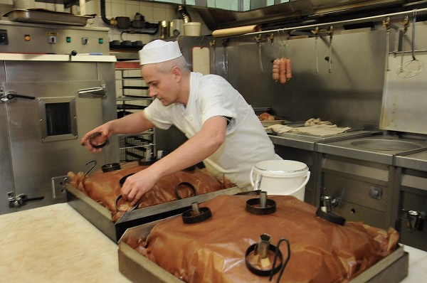 Vient ensuite la mise au four (par deux pâtés à la fois) à forte T° pendant un laps de temps assez court. Les pièces sont ensuite retournées, couvertes avec du papier enduits de saindoux, remise au four et retournées régulièrement, sept heures durant.