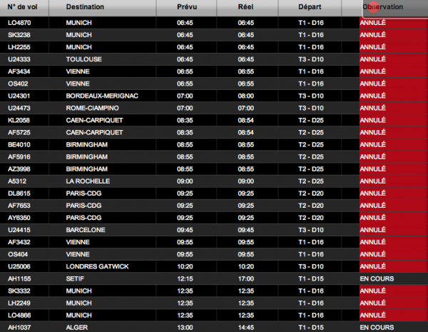 Du côté de Saint-Exupéry, après 141 vols annulés hier mercredi 1 décembre (37% du trafic), depuis ce matin sur 26 vols aériens 24 ont été annulés !