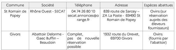 Pour répondre à toutes les demandes, les particuliers désirant s’approvisionner en animal sacrifié ou les éleveurs désirant faire abattre leurs agneaux à cette occasion, peuvent également contacter, le plus précocement possible, les établissements d’abattage agréés à proximité du département :