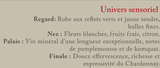 On se retrouverait presque dans l’univers des cuvées R. Lalou avec ce Blanc de Noirs. Mais n’est-il pas vrai que le maître de chai Didier Mariotti sait si bien imprimer sa touche personnelle sur l’ensemble des grands crus en particulier ?