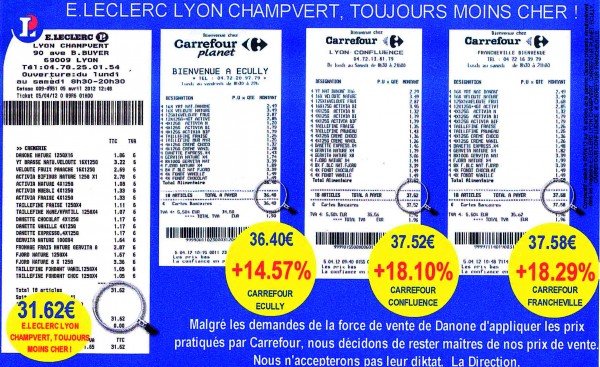 Le PDG de se Leclerc est un xxxxxxx de première. Leclerc étant l’enseigne de supermarché ayant le plus de magasins, ils ont souvent les meilleurs accords de la grande distribution. Le consommateur il s’en moque. Ce qui compte s’est son image prix pour ne pas perdre sa clientèle et ce qui le gêne s’est de réduire sa marge pour continuer à rester le moins cher, le crédo de son groupement. Cela l’embête de perdre à son propre jeu face à Carrefour et surtout qu’en tant que propriétaire du magasin il s’en met moins dans les poches. Il faut savoir que cette enseigne racket souvent les fournisseurs avec des accords à la base monstrueux, ils ne sont jamais content et en veulent toujours plus dans les poches afin de payer sa luxueuse voiture, sortir maman sans pour autant embauché où payer mieux ces salariés exploités. Danone n’a surement pas voulu consentir à donner de la marchandise gratuite pour compenser ce que le magasin perdait de marge en baissant ces prix pour s’aligner. Une réaction d’orgeuil pour un PDG orgueilleux, imbu de lui-même, menteur, de mauvaise foi qui se la pète dans sa supérette !