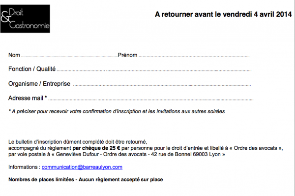 Inscription obligatoire (avec le chèque de 25€ rempli à l’ordre du Barreau de Lyon) envoyée à: