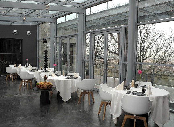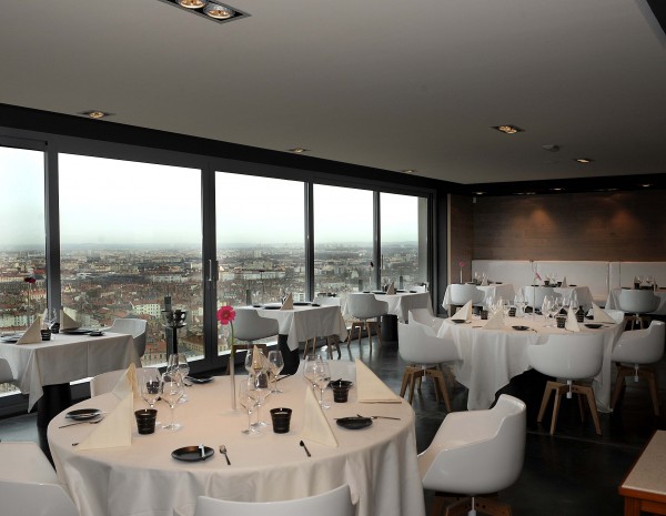 A l’image des nouvelles créations, le restaurant se présente dans sa simplicité la plus pure. Sol de béton peint en noir, murs blancs. Est-ce pour donner plus de crédit à l’une des plus belles vues de Lyon, pratiquement 160°, ou tout simplement par soucis d’esprit monastique ?