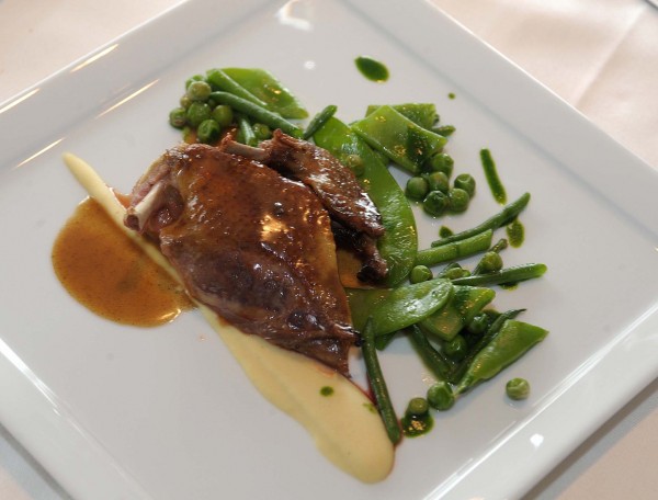 Puis sonne l’heure du pigeonneau, rosé à cœur et à la cuisson exceptionnelle. Une viande savoureuse et bien marquée accompagnée d’une farandole de légumes al dente d’un vert très printanier qui supporteraient un passage à la salamandre lorsqu’elle sera en fonctionnement.