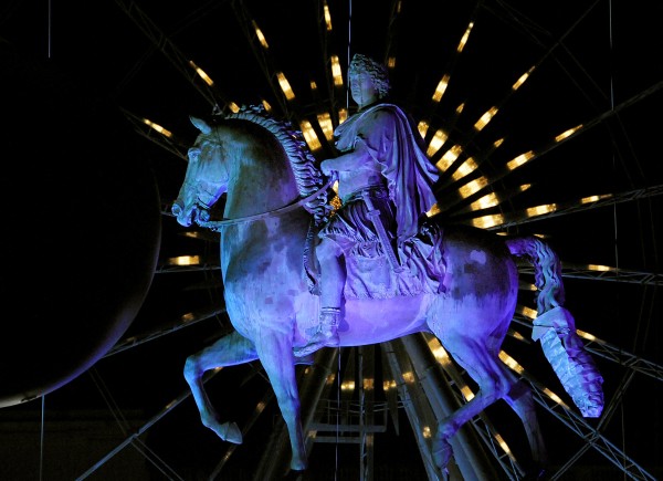 Un panneau géant en polycarbonate translucide et lumineux sera posé devant un mur de Leds sur le socle de la statue de Louis XIV. Le rayonnement de ces dernières se diffractant au contact du panneau et créant ainsi un jeu de lumières surprenantes. Et comme preuve d’interactivité, les spectateurs pourront pédaler sur 28 Vélo’V, dont 8 plus petits pour les enfants, pour faire évoluer l’intensité et les couleurs du panneau.