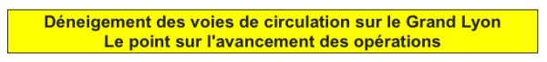 · Pour les problèmes de déneigement, le standard neige : 04 78 95 88 44. Les informations sur le déneigement sont relayées sur la page d’accueil de www.grandlyon.com, les radios locales et les panneaux à messages variables.