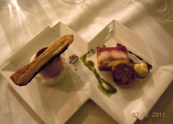 « Oublié » et « cube » offraient aux duellistes des thèmes plus familier pour le plat principal. Mais là encore, ils n’en ont pas moins affirmé leur différence d’inspiration : filets de canard de la Dombes et déclinaison de légumes d’autrefois pour Olivier Delbergues ; trilogie de cubes de cochon, légumes oubliés et racines en folie pour Franck Delhoum…