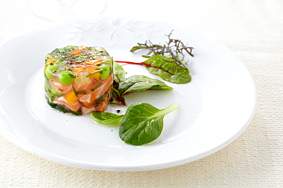 Dans des petits emporte-pièce de 6 cm de diamètre ou des petits ramequins en verres, déposer un film, verser une cuillère de gelée, puis des légumes, de nouveau un peu de gelée, puis le saumon juste mariné au jus de citron.