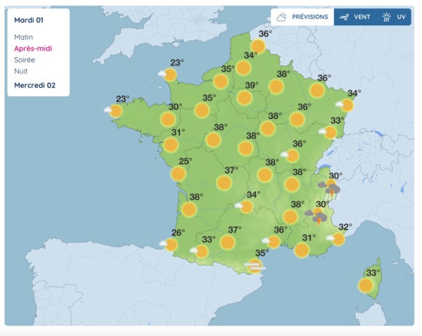 Voici les températures maximales prévues pour le mardi 01 juillet 2025 : Brest : 23 Paris : 39 Lyon : 38 Biarritz : 30 Cherbourg : 25 Tours : 39 Clermont-Fd : 37 Perpignan : 38 Rennes : 34 Nancy : 37 Limoges : 39 Marseille : 37 Nantes : 35 Strasbourg : 36 Bordeaux : 39 Nice : 32 Lille : 37 Dijon : 37 Toulouse : 39 Ajaccio : 33