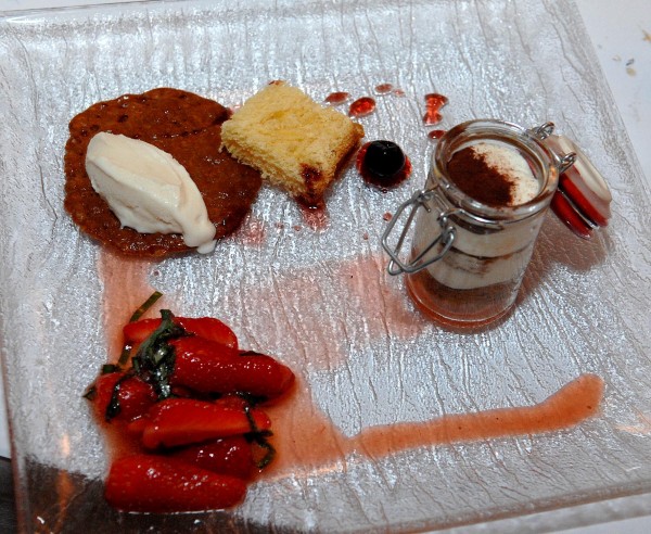 Pour les desserts, il nous a été donné de goûter une assiette gourmande offrant un panel des desserts réalisés par le chef Sébastien Charrue. Les garriguettes catalanes, manquant encore de saveurs printanières ensoleillées, sont traitées à l’huile d’olive, au citron, au poivre et au basilique. Le Panettone a retenu quant à lui toute notre attention, un peu plus du reste que le tiramisu servi en verrine.