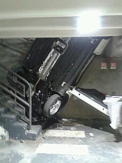 Une mauvaise manœuvre l’a entraînée dans les escaliers qu’elle a descendu la tête (de la voiture) la première.