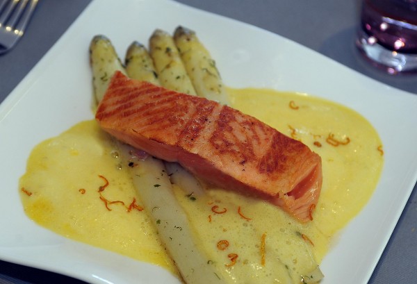 En plat chaud, ce jour là le chef proposait une aile de raie bouclée cuite à la plancha avec fenouil et blé comme une salade, des asperges blanches de Mr Clamaron avec une tranche de saumon fumé snackée et une brochette de bœuf avec sa pomme Pont Neuf de polenta et pesto de roquette.