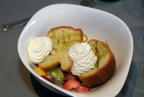 Bien entendu il vous reste une petite place pour les gourmandises, comme pour ce petit bouchon (un baba) des Pères Chartreux aux fruits de saison. Grand amateur et collectionneur de Chartreuses, le chef sait être plus que généreux !