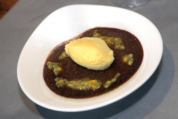 Pour les amateurs de chocolat, la crème brûlée au Grand Chocolat Valrhona s’accompagne à merveille d’un sorbet exotique rehaussé par quelques grains de passion (les fruits !).