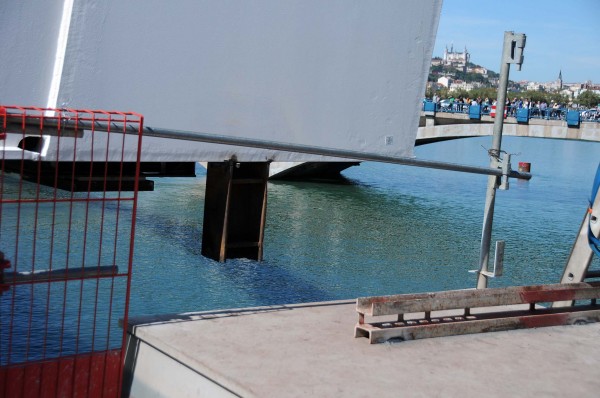 Ce tablier est donc opérant du côté Gerland et arrive à quelques mètres de la rive Perrache. Un espace de quelques dizaines de mètres qui sera comblé par un second tablier, de 600 tonnes cette fois.