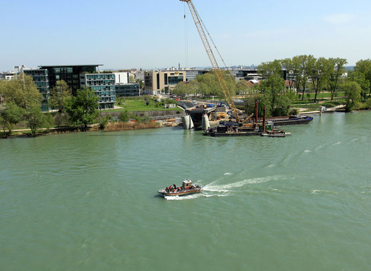 A partir du lundi 29 juillet et jusqu’au mardi 30 juillet 2013 en fin de soirée, le tronçon central du pont Raymond Barre va être acheminé sur le Rhône depuis le port Edouard Herriot jusqu’à son positionnement définitif en aval du pont Pasteur (Lyon 7).