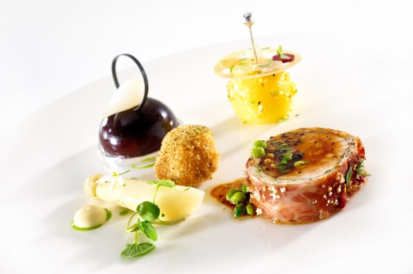 Rôti de veau au jambon de Skagen, gressillons soufflés, airelles et pain noir