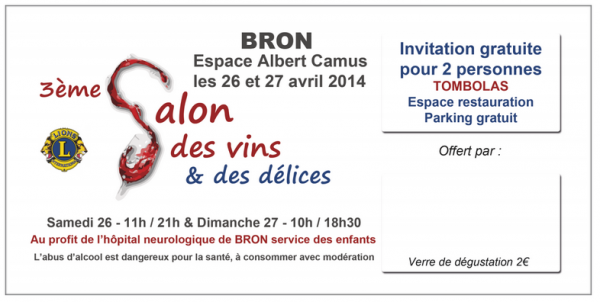 A l’initiative du Lions Club Aéroport, le Salon des Vins et des Délices se tiendra à Bron, salle Albert Camus les 18 et 19 avril 2015, et ce pour la quatrième année consécutive.