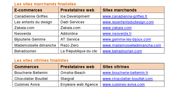 10 finalistes ont été présélectionnés par un jury de professionnels, 7 sites marchands et 3 sites vitrines