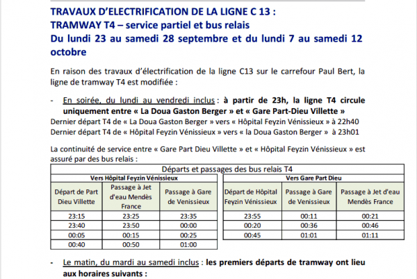 Suite à des travaux d’électrification sur la ligne C13 des TCL, quelques perturbations sont à envisager, en particulier sur la ligne T4 du Tramway.