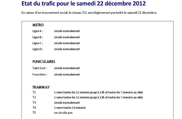 Communiqué officiel  –  Etat du trafic pour le samedi 22  décembre 2012