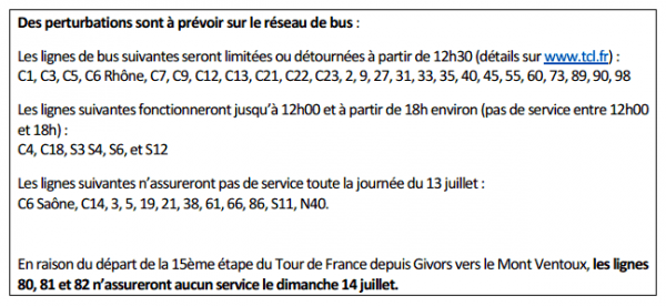 Les TCL, Transports en commun lyonnais s’adaptent à cette situation aussi conviviale que perturbée en matière de circulation… le 13 mais aussi le 14 juillet.
