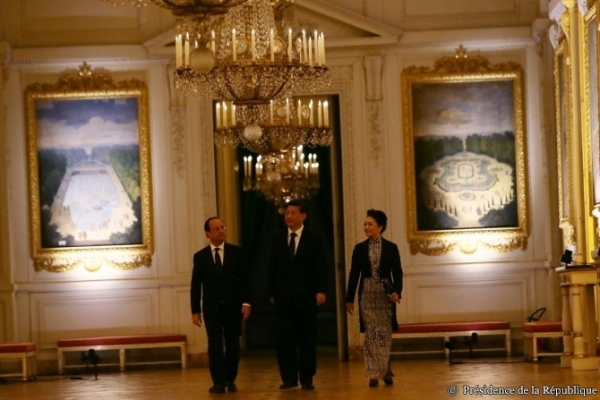 Ce menu à trois ( sans compter les deux interprètes en retrait), s’est déroulé en présence du Président de la République de Chine populaire Xi Jinping, de son épouse Peng Liyuan et de leur hôte François Hollande célibataire avec un plan de table « triangulaire ».