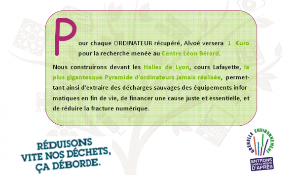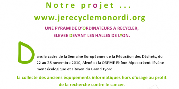 Cette opération jerecyclemonordi.org, est organisée en faveur de la recherche contre le cancer menée au Centre Léon Bérard de Lyon. Un petit euro sera versé au Centre Léon Bérad pour chaque ordinateur apporté. Cet évènement sera aussi l’occasion d’une tombola avec remise de lots autour de l’informatique et de la gastronomie. Le tout se déroulant ce dimanche 28 novembre à 11h00, toujours à la Halle de Lyon Paul Bocuse.
