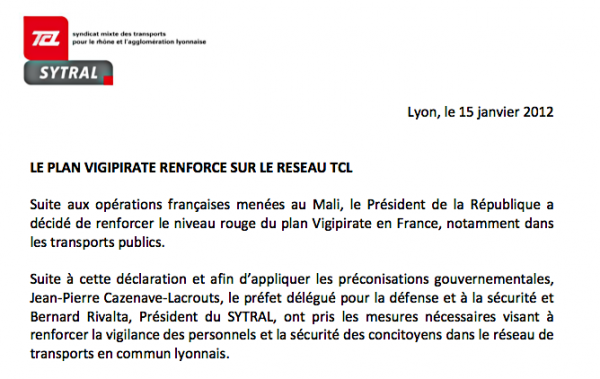Ainsi à Lyon, de son côté, le Sytral joue activement le jeu du plan Vigipirate