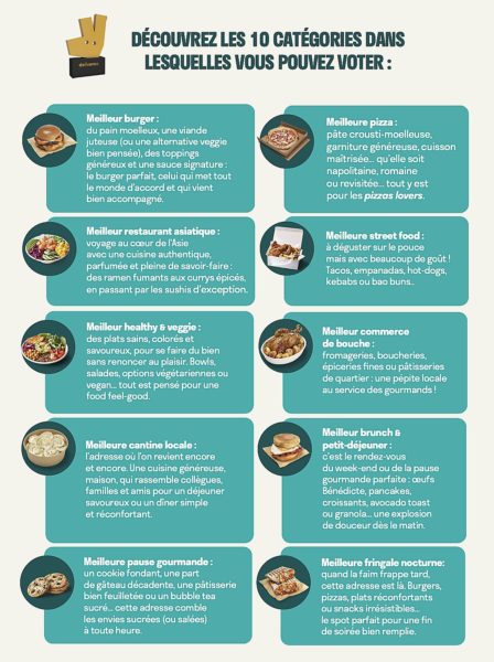 Meilleur burger, meilleure pizza, meilleur street-food, meilleur restaurant asiatique, meilleur commerce de bouche, meilleure cantine locale, meilleure pause gourmande, meilleure fringale nocturne, meilleur brunch et petit déjeuner, meilleur healthy et Veggie.